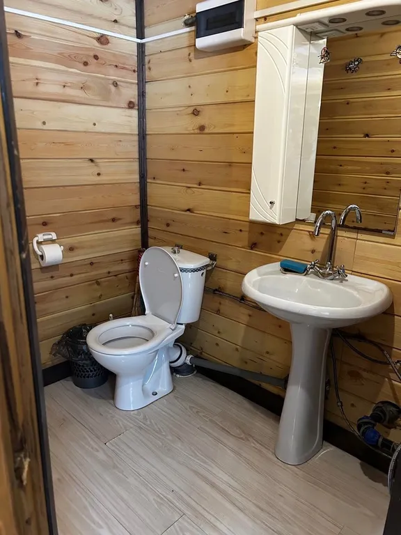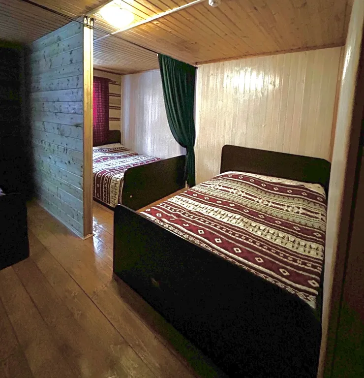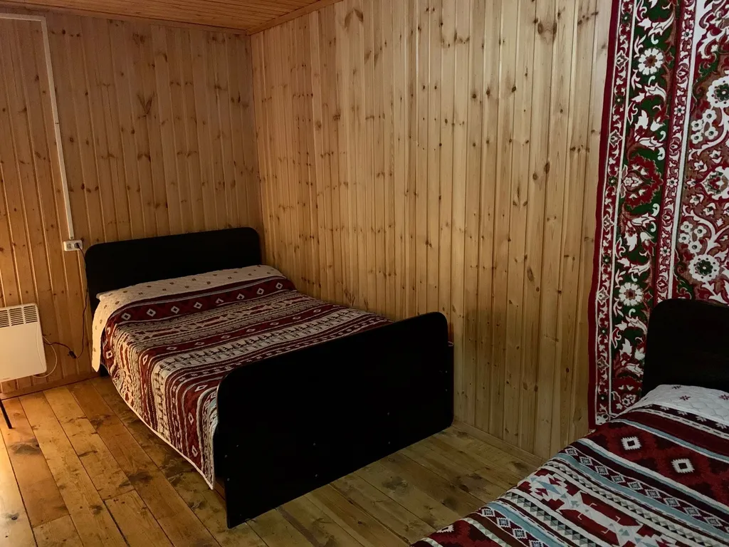 Коттедж состоит из двух этажей. Первый этаж: Кухня-гостинная с большим столом, санузел. Второй этаж: первая спальня - 3 двуспальные кровати, вторая спальня - 2 двуспальные кровати. Дом вмещает до 10 гостей.